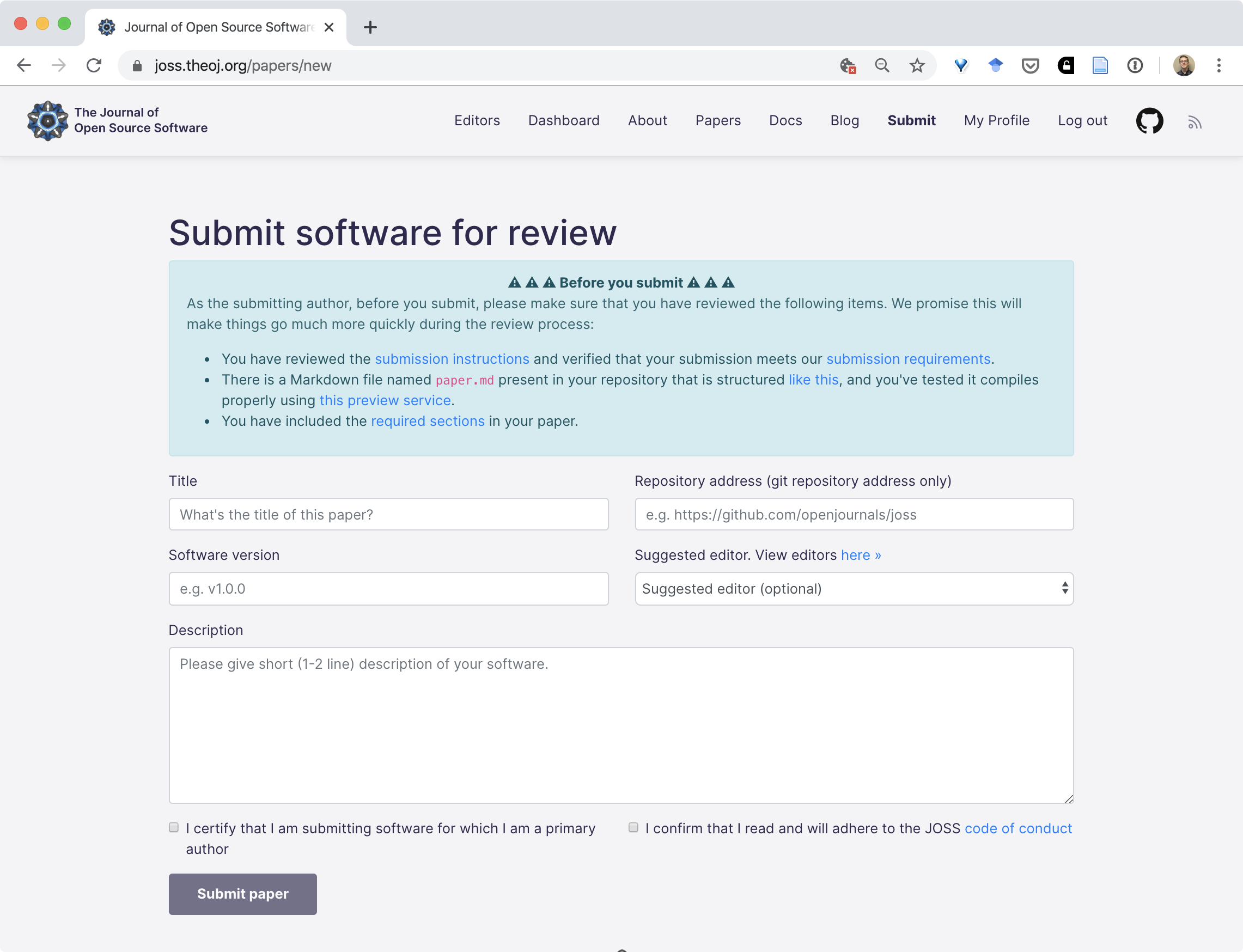 “If you've already licensed your code and have good documentation then we expect that it should take less than an hour to prepare and submit your paper to JOSS.”